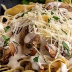 ızgara tavuk dilimleri, alfredo sos, penne makarna, mantar, dilim zeytin ve permesan peynir