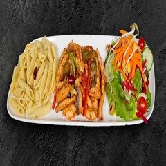 Özel soslu makarna, Akdeniz salata ile