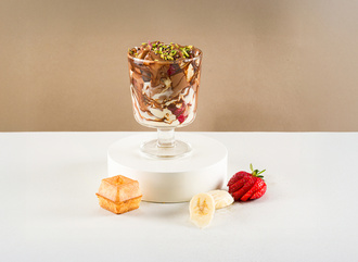 120 g Belçika çikolatası, muz, çilek, özel yapım krema, krep kırığı, bisküvi kırığı.