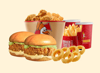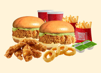 2 Adet Single Tavuk Burger + 6 Adet Kemiksiz (Tenders) + 4 Adet Soğan Halkası + 2 Adet Patates Kızartması + 2 Adet Kutu İçecek ve 2'şer Adet ketçap_ mayonez ile servis edilir.