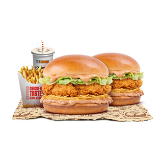 2 Adet Tavuk Burger + 1 Adet Patates Kızartması + 1 Adet Kutu İçecek ve 1'er Adet ketçap_ mayonez ile servis edilir.