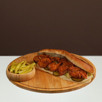 Süt ekmek arası tavuk döner (80 gr). Domates, marul, patates kızartması, ketçap, mayonez ile hazırlanır. Biber turşusu ile servis edilir.