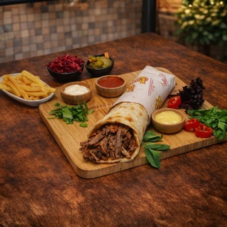 Pide ekmeğinde et döner dürüm (80 gr). Domates, patates kızartması ve özel salça sos ile hazırlanır. Biber turşusu ile servis edilir.