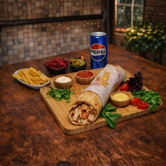 Zurna tavuk döner (100 gr). domates, patates kızartması ve özel salça sos ile hazırlanır. biber turşusu ile servis edilir.