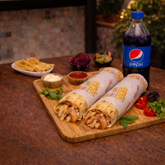 5 adet tavuk döner dürüm (80 gr) + 2.5 litre içecek menü. büyük boy patates kızartması ile servis edilir.