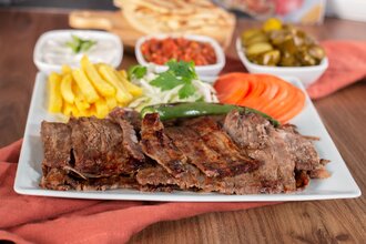 Et döner, patates kızartması, maydanozlu soğan ve ehli hatay sos ile