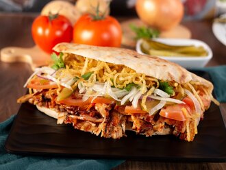 Özel tandır gobit ekmeği, yaprak tavuk döner, domates, maydanozlu soğan, çıtır saman patates, közlenmiş tereyağlı patlıcan, yeşil biber ve kapya biber karışımı