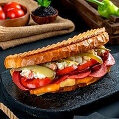 Ayvalık Tostu (Kaşar peyniri, sucuk, salam, Amerikan salatası, domates, turşu, ketçap, mayonez, isteğe göre domates, yeşil biber, ketçap, mayonez) + Patates Kızartması + Kutu İçecek