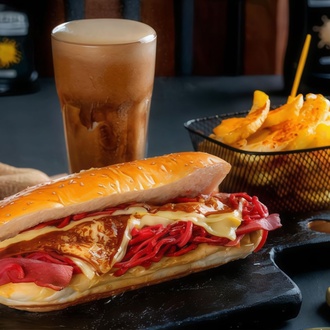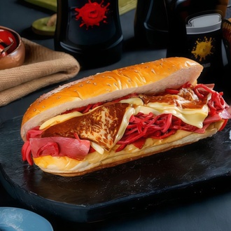 XL hot dog ekmeğine; 129 gr. kızarmış sosis, kaşar peyniri , patates kızartması, turşu, isteğe göre ketçap, mayonez, hardal sos