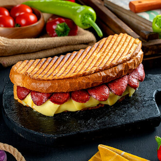 Kaşar peyniri, sucuk, isteğe göre domates, yeşil biber, ketçap, mayonez