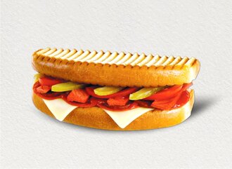 Tavuk burger, domates, salatalık turşusu, mayonez
