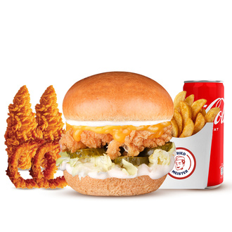 Kızarmış Meister Tavuğu ( 150 g ) , Panelenmiş kaşar , Cheddar sos , Alman Turşusu , Iceberg , Meister Dip Sos , Patates Kızartması , Brioche , Seçeceğiniz 2 Adet Sos ve İçecek Seçimi ile Birlikte.