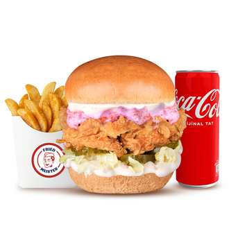 Kızarmış Meister Tavuğu ( 150 g ) , Coleslaw , Alman Turşusu, Iceberg , Lime Limon, Meister Dip Sos , Patates Kızartması , Brioche , Seçeceğiniz 2 Adet Sos ve İçecek Seçimi ile Birlikte.