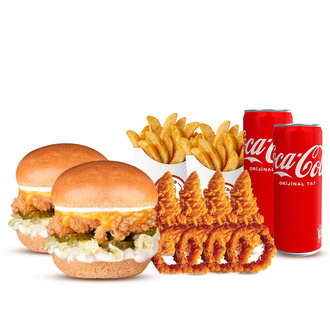 Seçeceğiniz 2 Adet Tavuk Burger – 4 Adet Homemade Soğan Halkası – 4 Adet Sweet Chili Soslu Lokmalık Tenders – Patates Kızartması – Seçeceğiniz 4 Adet Sos İle Birlikte ve 2 İçecek Seçimi ile Birlikte.