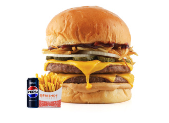 %100 Dana Friends Köfte (240 gr),Brioche Ekmeği, Double Cheddar Peyniri, Kibrit Patates, Turşu, Soğan, BBQ Sos, My Friends Gurme Sos Patates Kızartması, İçecek