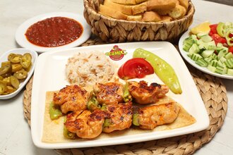 350gr. Piliç, pilav, salata, ezme ve ekmek ile servis edilir.