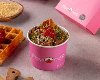 Waffle parçacıkları, muz, çilek, seçeceğiniz 2 çeşit çikolata