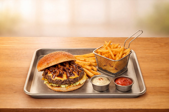 260 gr hamburger köftesi, 30 gr cheddar peyniri, 15 gr karamelize soğan, barbekü sos, 30 gr göbek yeşillik, turşu sos ve baharatlı patates kızartması ile servis edilir.