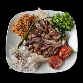 240 gr. kuzu şiş (çift şiş). Bulgur pilavı, Antep ezme, kuru cacık, kırmızılahana, sumaklı soğan, pişmiş domates, pişmiş biber ile