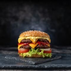 125 gr. dana burger köfte, panelenmiş çıtır tavuk, turşu, domates, soğan turşusu, cheddar sos. Patates kızartması, özel sos ile