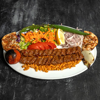 Roka, domates, sumaklı soğan, fındık lahmacun, lavaş ekmeği, bulgur pilavı ile