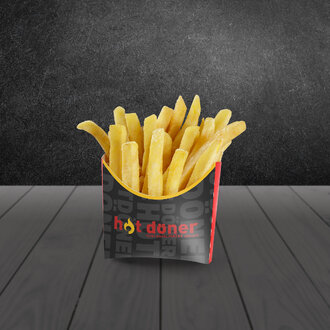 1,5 Kızarmış lavaş ekmeği, 90 g et döner, Hot Döner et sosu, patates kızartması, dilim kornişon turşu