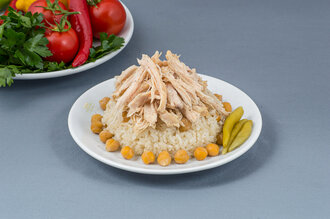 Tane tane pirinç pilavı üzerine didiklenmiş haşlanmış tavuk göğsü ve nohut eklenerek günlük hazırlanır. Doyurucu ve klasik lezzet. Turşu ve Karabiber Seçeneği İle Birlikte Şimdi Sofralarınızda Afiyet olsun.