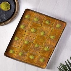 1/2 bütün fıstık, 1/2 kırma fıstık, 1/2 kaymaklı, 1/2 peynirli. Tepside servis edilir.
