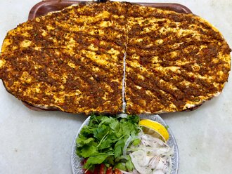 Lahmacun, adana kebap, domates, soğan, maydanoz, limon