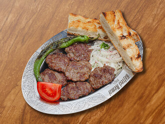 (180 - 220 gr.) Kuzu eti, soğan, domates, biber, kızarmış ekmek, bulgur pilavı