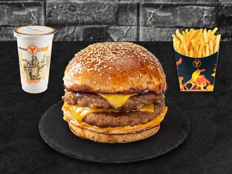 Çiftli Burger (2 adet burger köftesi, 2 adet cheddar peyniri, burger sosu) + Küçük Boy Patates + İçecek (25 cl.) (Menü görsellerinde bulunan seçenekli ürünlerden 1 adet ürün seçimi yapabilirsiniz.)