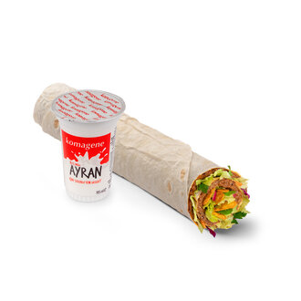 Çiğ Köfte Dürüm (90 gr. çiğ köfte, tek lavaş, seçeceğiniz 5 çeşit garnitür, seçeceğiniz 2 çeşit sos) + Komagene Ayran (17 cl.)