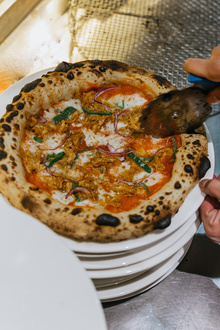 Urla domates sos, suda mozzarella peyniri (Fior di Latte), enginar kalbi, kuşkonmaz, roka, Bergama tulum peyniri, pesto sos, sızma zeytinyağı (400 derece meşe odunu ateşinde pişirilir.)