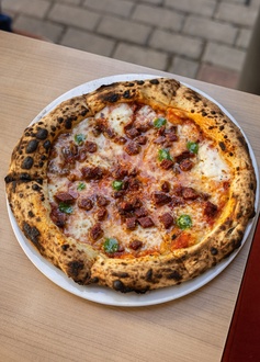 Urla domates sos, suda mozzarella peyniri (Fior di Latte), acı barbekü soslu tiftik tavuk, kırmızı soğan, köy biberi, sızma zeytinyağı (400 derece meşe odunu ateşinde pişirilir.)