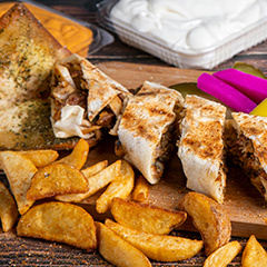 Lübb Porsiyon Döner 120gr. yanında pilav, soğan, közlenmiş biber, acı biber turşusu , ev yapımı patates kızartması ve ketçap mayonez ile servis edilir.