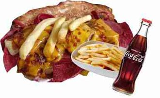 Sucuk, sosis, salam, çift kaşar peyniri, cheddar peyniri, patates kızartması, turşu, ketçap, mayonez