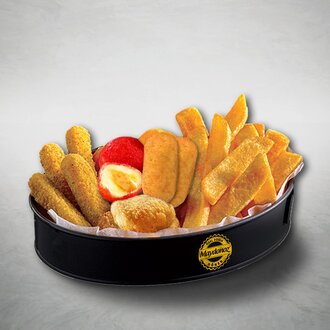 Çıtır tavuk, mozzarella sticks, cheddarlı patates topları, acılı cheddarlı patates topları, patates kızartması
