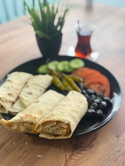 Baharatlı patates içi ve kaşar peyniri, domates, salatalık, turşu ve zeytin ile servis edilir