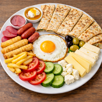 Beyaz peynir, top peynir, siyah zeytin, domates, salatalık, sigara böreği, patates kızartması, sosis, haşlanmış yumurta, salam ve dilim ekmek