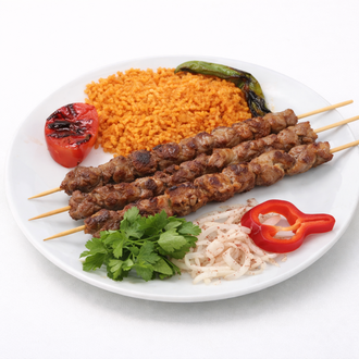 Zırhlanmış özel acısız urfa kebap, pilav, salata, sumaklı soğan, ezme, pide ve közlenmiş biber ile servis edilir.