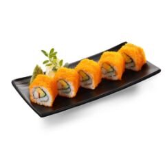 Tempura somon, avokado, salatalık, mayonez, dışı tobiko. Wasabi, zencefil turşusu, soya sos ile