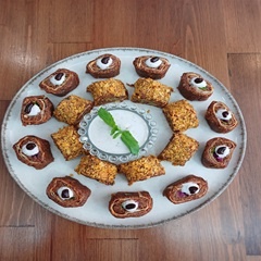 Zeytinyağlı, cevizli, fındıklı, bademli. 4 adet lavaş, iceberg marul, maydanoz, turşu, roka, nane, nar ekşisi, acı sos ile