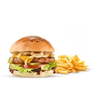 Cheeseburger (110 gr. et burger köftesi, cheddar peyniri, domates, marul, kornişon turşu, sos, hardal) + Patates Kızartması