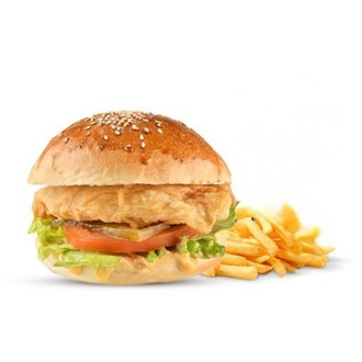 Çıtır Tavuk Burger (110 gr. tavuk burger köftesi, domates, marul, kornişon turşu, et sosu) + Patates Kızartması