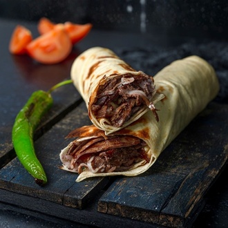 et döner dürüm (130 gram), soğan ve domates ile hazırlanır. Salata, ezme ve patlıcan mezesi ile servis edilir.
