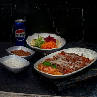 Servis et döner (130 gram)+ Seçtiğin İçecek (330 ml)+ Seçtiğin Tatlı ile hazırlanır. Salata, ezme ve patlıcan mezesi ile servis edilir.