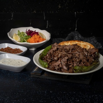 %100 Dana Etinden, Meşe Odunu Ateşinde Pişmiş Döner. Salata, Ezme, Patlıcan mezesi ve Tırnak Pide ile gönderilir.