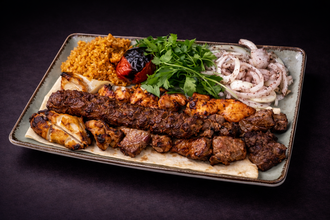 Dana Şiş, Adana Kebap, Izgara Köfte, Tavuk Şiş, Ciğer Şiş. Salata, Közlenmiş Domates, Biber Ve Bulgur Pilavı İle