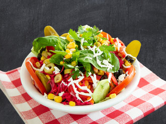 Mevsim salata, patates kızartması, soğan, lavaş ile