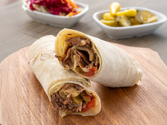 İsteğe göre patates kızartması, domates, soğan, turşu, acı biber turşusu, sos, marul